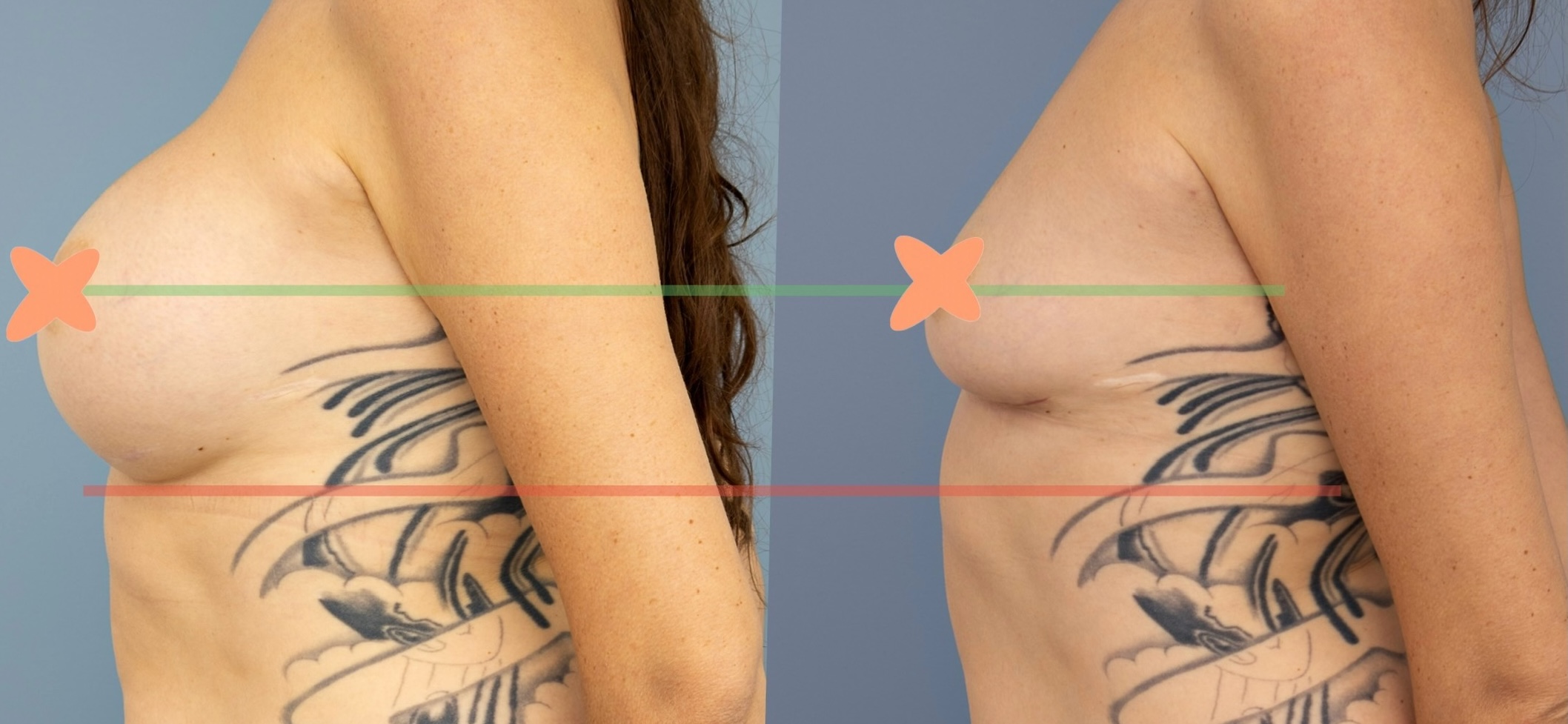 So the small breasted ladies will see the natural breast crease (which arises in part based on where the natural tissue sits) rise after explant. Therefore, we have to anticipate that by also elevating the previously lowered or weakened breast crease to try to increase the chance that the scar sits perfectly in the crease.